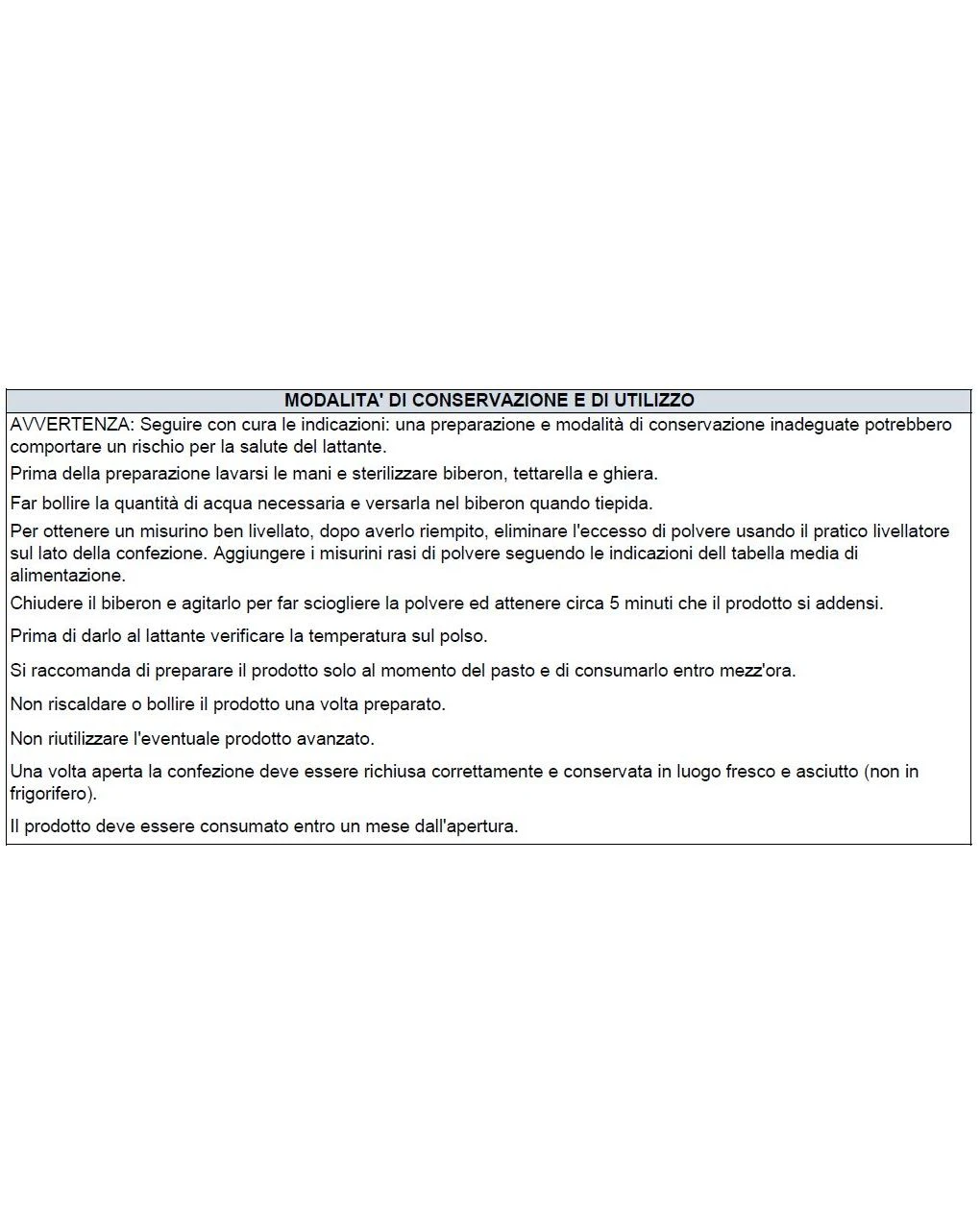 Il prodotto deve essere utilizzato sotto il controllo del Pediatra ed è indicato per lattanti dopo il 6° mese. Il prodotto non deve essere utilizzato come unica fonte di nutrimento. Il prodotto non deve essere utilizzato per via parenterale. Il prodotto non è adatto a lattanti prematuri. Importante: Il latte materno è l’alimento ideale per il lattante. E’ raccomandato come alimento esclusivo fino al sesto mese e come componente lattea di una dieta equilibrata durante lo svezzamento e anche dopo l’anno di vita.