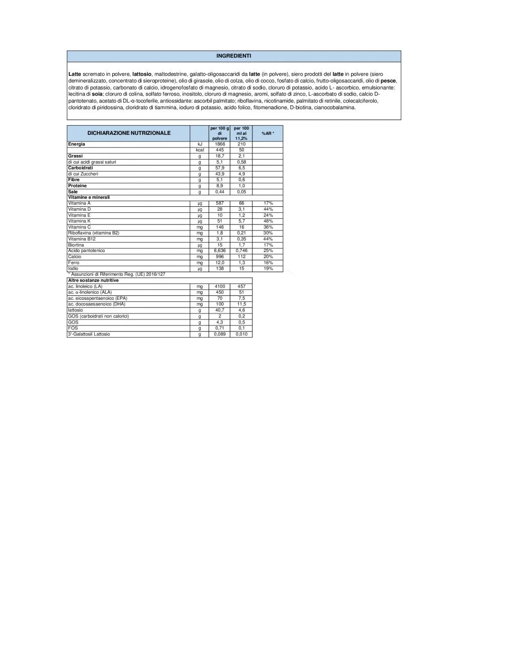 Il prodotto è una formula a base di latte scremato in polvere per bambini nella prima infanzia (dal 24° mese).