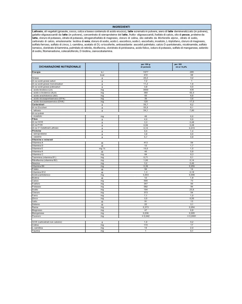 Avvertenze importanti: il latte materno è l’alimento ideale per il lattante ed è raccomandato come alimento esclusivo fino al 6° mese e come componente lattea di una dieta equilibrata durante lo svezzamento e anche dopo l’anno di vita. Se manca o è insufficiente si può utilizzare un latte di proseguimento solo su indicazione del Pediatra. Aptamil Nutribiotik 2 è idoneo per i lattanti solo dopo il compimento del 6° mese, non deve essere utilizzato come sostituto del latte materno nei primi 6 mesi di vita ed è da intendersi come parte di un’alimentazione diversificata. L’inizio dello svezzamento deve avvenire unicamente seguendo le indicazioni del Pediatra. ” Latte di proseguimento Aptamil Nutribiotik 2 in polvere, nel formato convenienza da 1,2 kg. Contiene una miscela prebiotica di Fibre GOS-FOS (galatto-oligosaccaridi e frutto oligosaccaridi). Con Immunonutrienti (vitamine C e D), che contribuiscono al normale funzionamento del sistema immunitario, Omega-3 (ALA e DHA) e 6 e il 3’GL HMO. 14,0 12,0 19,3 1.2kg.