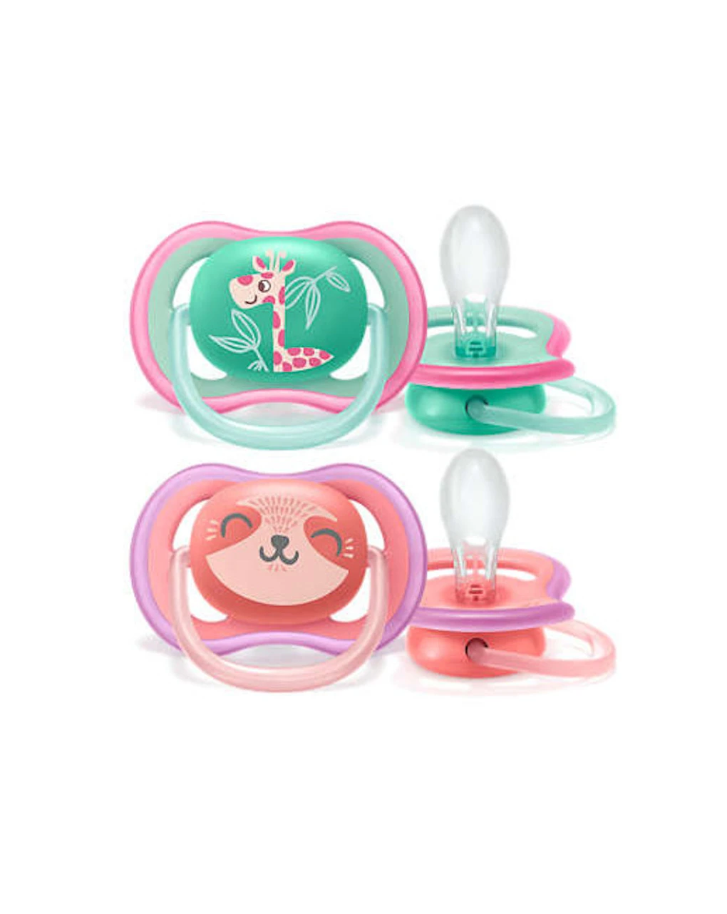 Calma il tuo bambino con un succhietto che lascia respirare la pelle e favorisce uno sviluppo sano del cavo orale. ultra air 18M+ è dotato di fori extra-large per mantenere morbida e asciutta la pelle delicata dei bimbi e di una tettarella estremamente robusta per gengive e denti che crescono.”