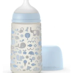 BIBERON MEMORIES 270ML SILICONE TETTARELLA SIMMETRICA SX PRO AZZURRO presenta una nuova forma dritta della bottiglia offrendo un’impugnatura più comoda e un coperchio interno di protezione per evitare la fuoriuscita del latte. La nuova tettarella favorisce una suzione più naturale possibile e rispetta lo sviluppo del palato. La tettina piatta e simmetrica, di silicone sottile ultra-morbido leggermente rugoso, ha un collo più lungo e centrato rispetto alla base con la valvola anticolica.