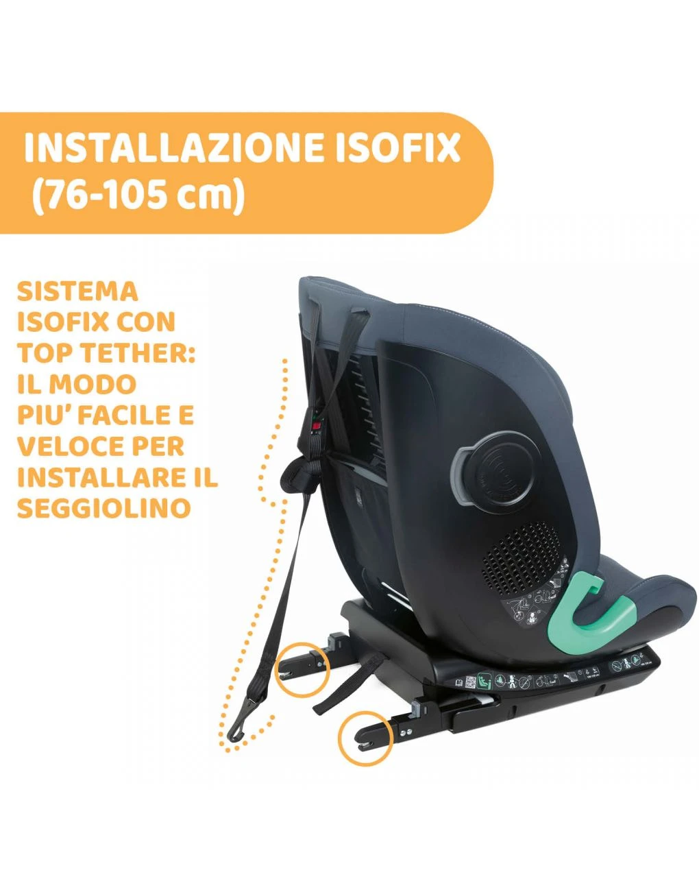 – Seggiolino omologato secondo la normativa i-Size ECE R129/03: dai 76 ai 150 cm di altezza del bambino