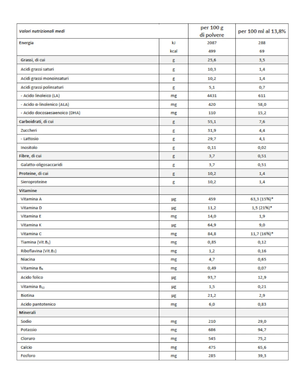 Con sieroproteine del latte vaccino, una miscela lipidica con un olio vegetale ad alto contenuto di beta-palmitato, DHA un acido grasso essenziale Omega 3.