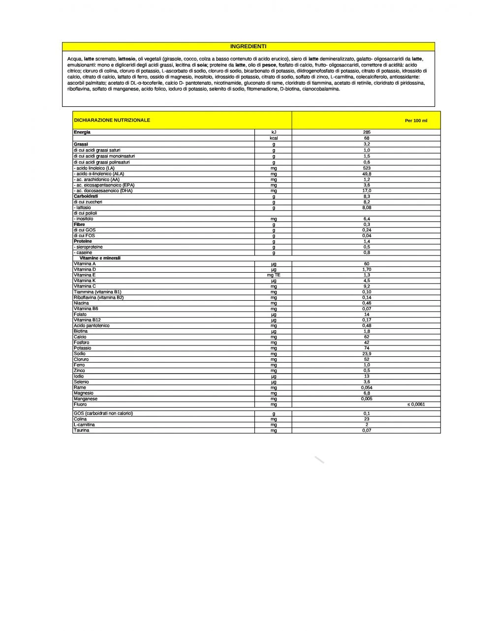 Con miscela prebiotica di Fibre GOS-FOS (0,8 g/100 ml), con DHA*: acido grasso polinsaturo della serie Omega 3. Fonte di Vitamine* A, B2, B12, C, D, E e K.