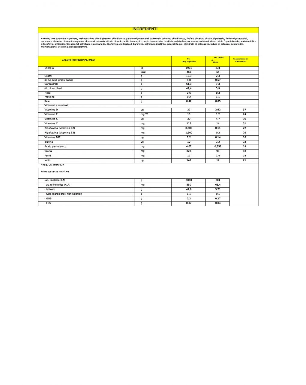 E’ studiato per rispondere alle esigenze specifiche del bambino nella prima infanzia dopo due anni. Perché contiene la miscela Prebiotica GOS-FOS (galatto-oligosaccaridi e frutto-oligosaccaridi, 9:1) che favorisce l’equilibrio della flora intestinale. Fonte di ferro che contribuisce al normale sviluppo cognitivo. Fonte di calcio e ricco di vitamina D che contribuiscono al sano sviluppo delle ossa. Fornisce un apporto bilanciato di proteine.