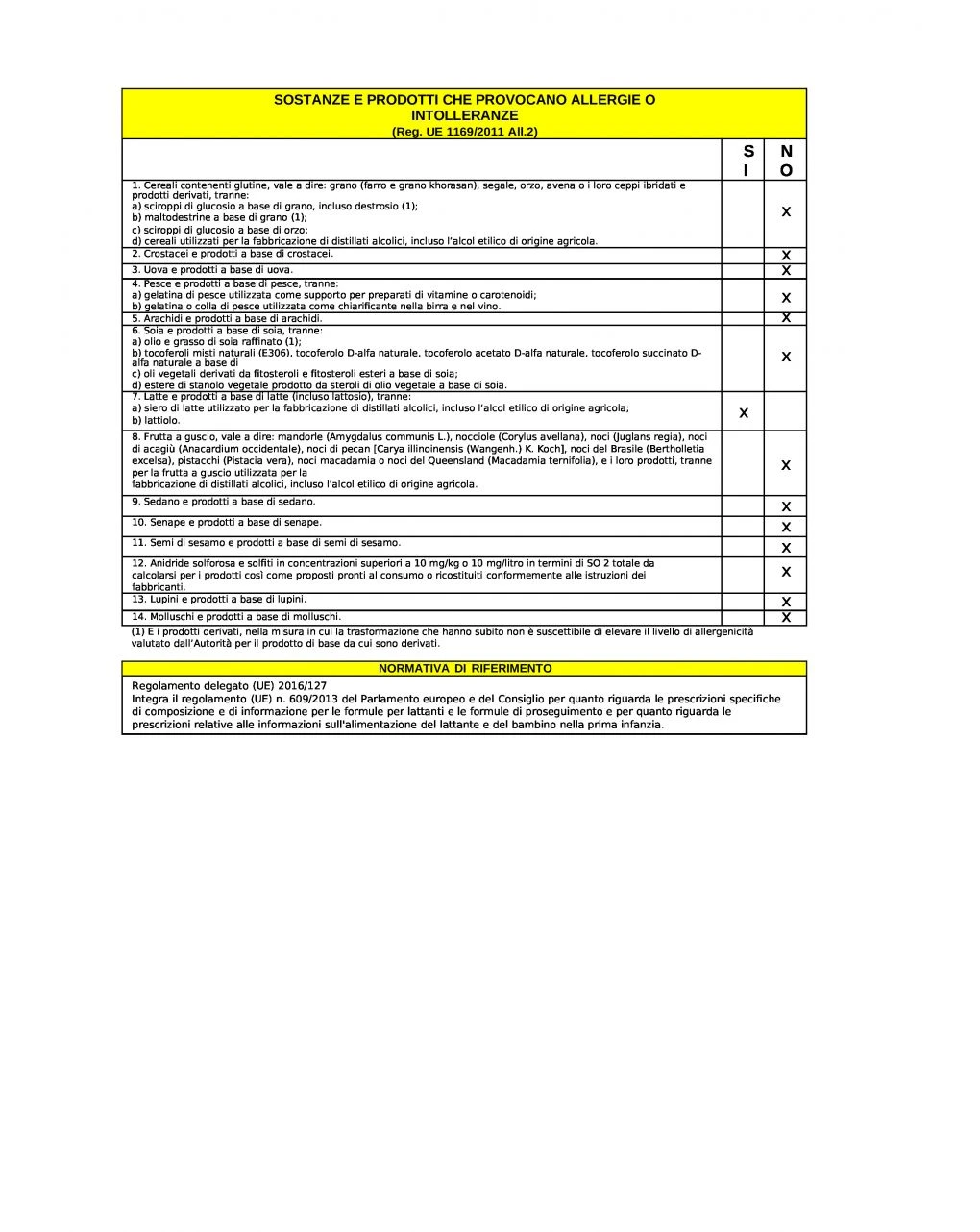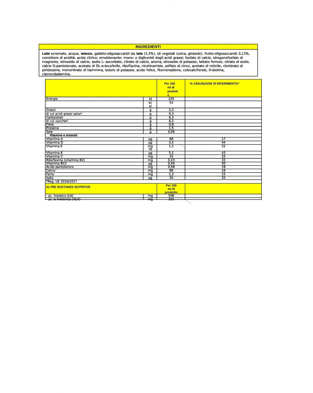 Latte scremato, acqua, lattosio, galatto-oligosaccaridi da latte (2,3%), oli vegetali (colza, girasole), frutto-oligosaccaridi 0,12%, regolatore di acidità: acido citrico, emulsionante: mono- e digliceridi degli acidi grassi, fosfato di calcio, idrogenofosfato di magnesio, idrossido di calcio, sodio L-ascorbato, citrato di calcio, aroma, idrossido di potassio, lattato ferroso, citrato di sodio, calcio D-pantotenato, acetato di DL-α-tocoferile, riboflavina, nicotinamide, solfato di zinco, acetato di retinile, cloridrato di piridossina, mononitrato di tiammina, ioduro di potassio, acido folico, fitomenadione, colecalciferolo, D-biotina, cianocobalamina.