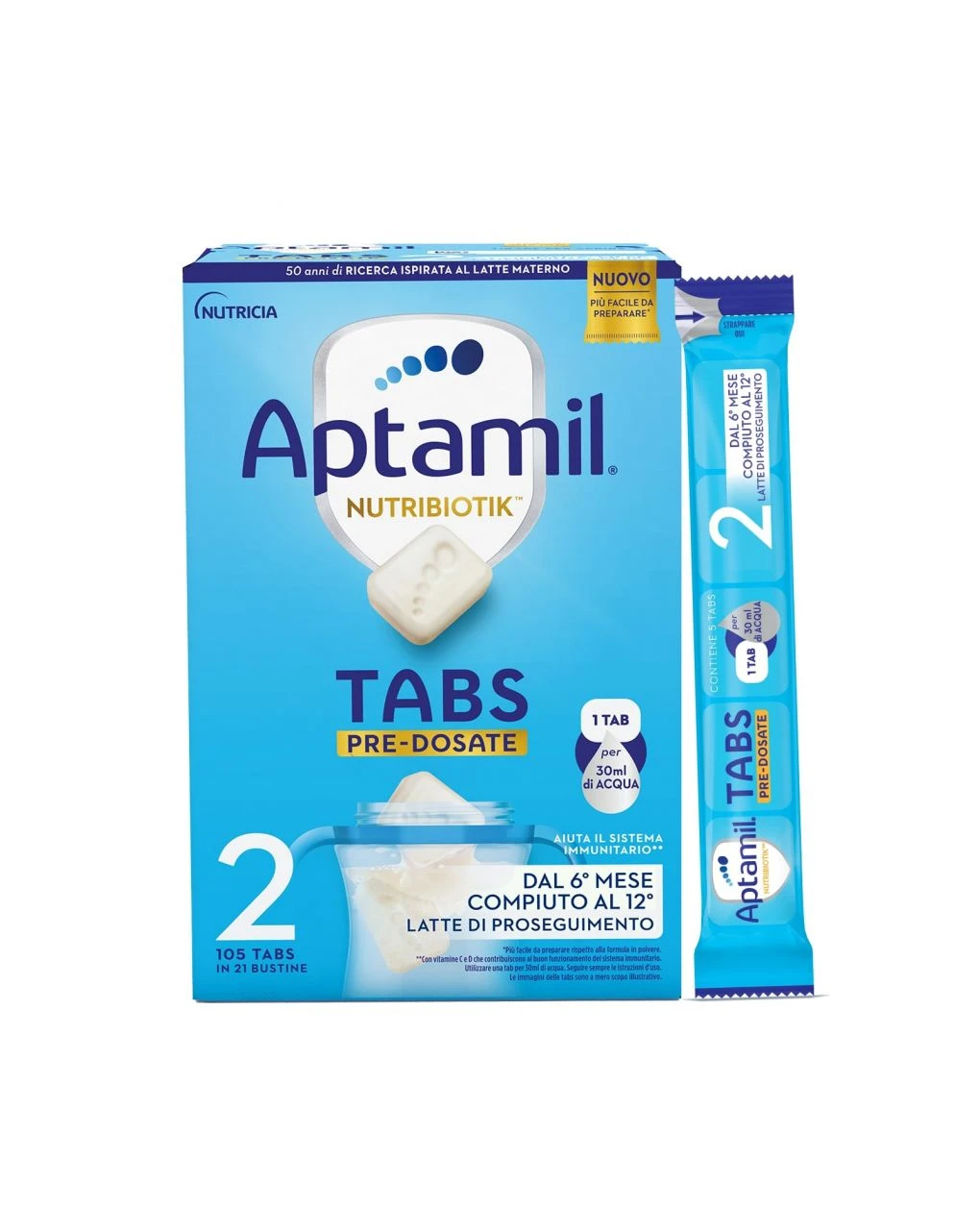Aptamil Nutribiotik tabs 2 pre-dosate è un latte di proseguimento in polvere sotto forma di compressa pre-dosata, appositamente studiato per soddisfare le esigenze nutrizionali del lattante dal 6° mese compiuto fino al 12°, quando l’allattamento al seno non è possibile, solo su parere del Pediatra.