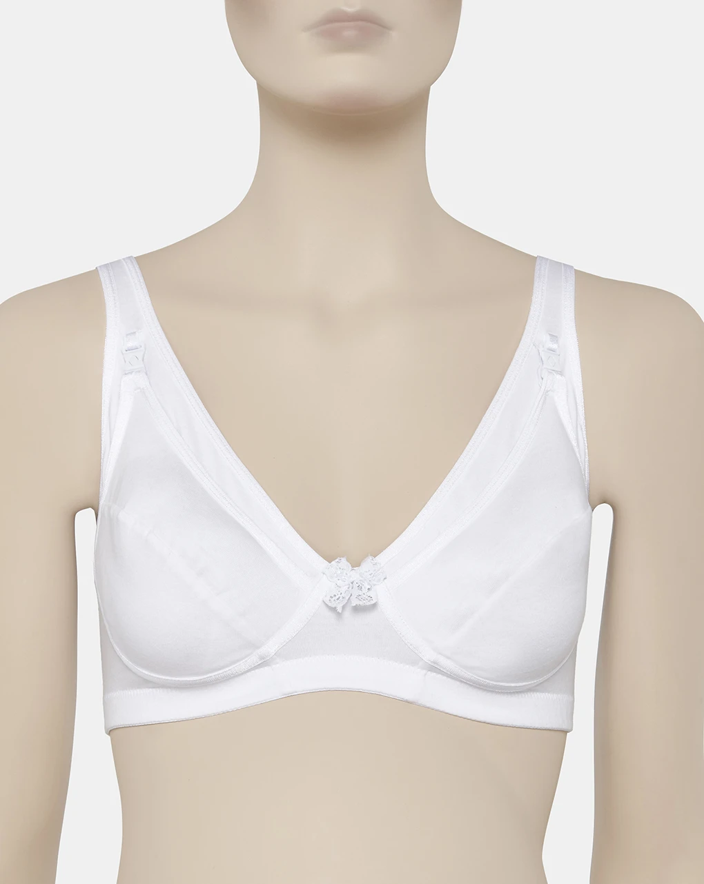 Reggiseno da allattamento in leggero e resistente lycra di cotone bianco con coppa C e un piccolo fiocchetto in pizzo ton sur ton applicato al centro. Forma e materiali sono studiati per sostenere il seno senza costringerlo, le coppe sono apribili e le spalline sono imbottite e regolabili. Pratica chiusura con ganci regolabili.