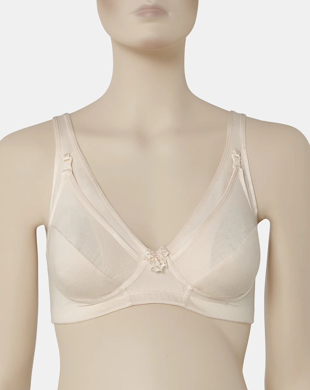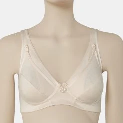 Reggiseno da allattamento in leggero e resistente lycra di cotone cipria con coppa D e un piccolo fiocchetto in pizzo ton sur ton applicato al centro. Forma e materiali sono studiati per sostenere il seno senza costringerlo, le coppe sono apribili e le spalline sono imbottite e regolabili. Pratica chiusura con ganci regolabili.