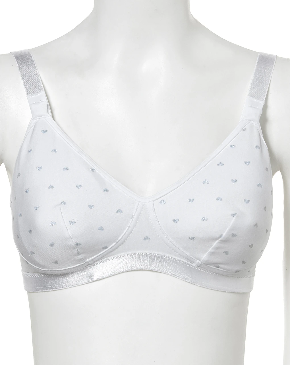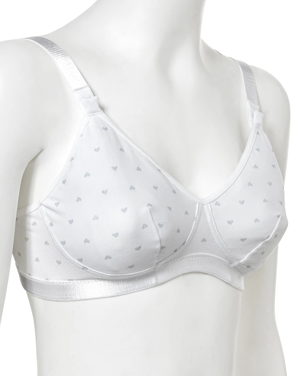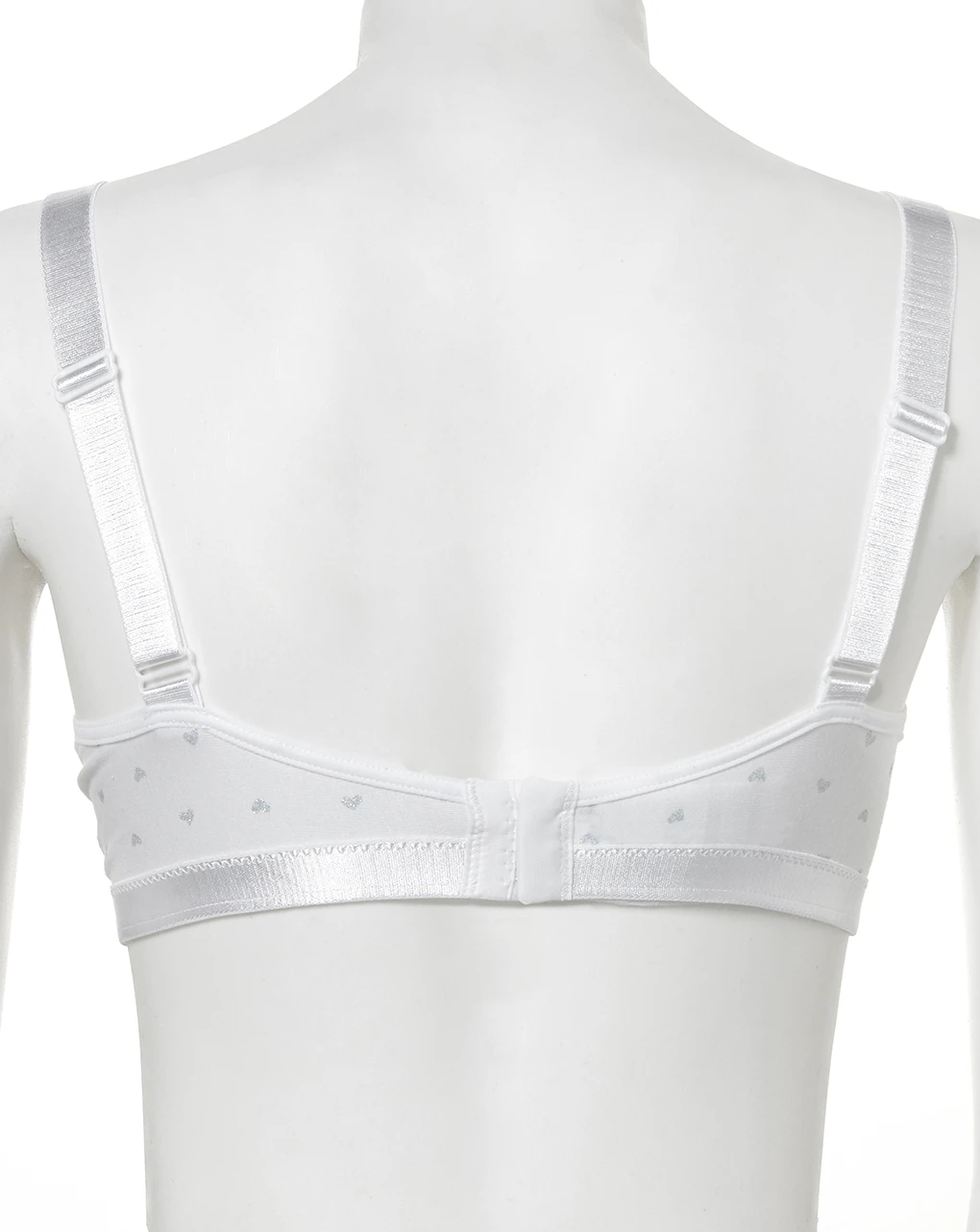 Pratico reggiseno allattamento bianco con stampa all-over di cuori glitterati con coppa C apribile, chiusura sul retro con ganci regolabile e spalline elastiche.