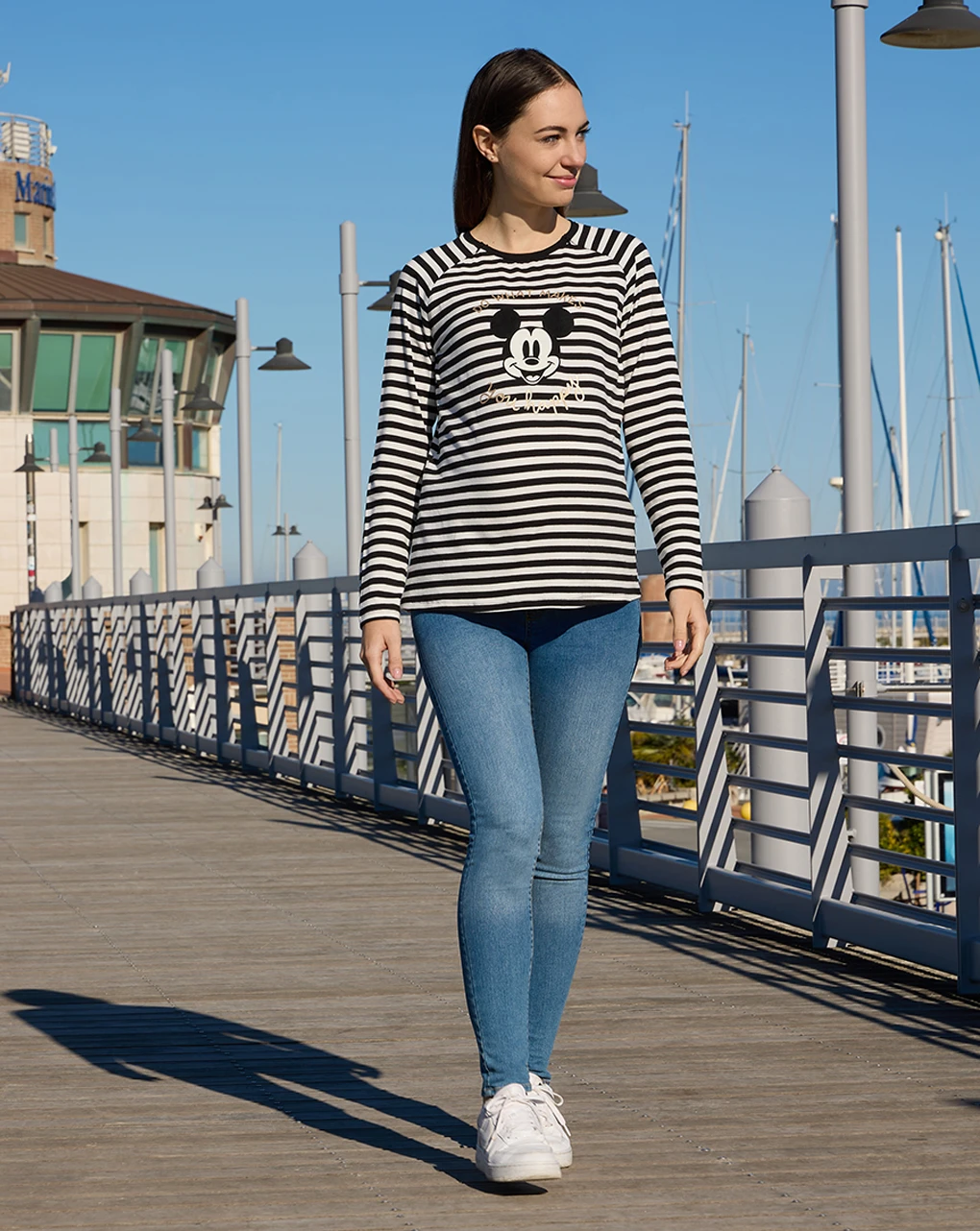 T-shirt premaman manica lunga in morbido jersey dalla qualità elastica e confortevole, con righe bicolor bianche e nere bianche che creano un giocoso impatto visivo. Sul davanti, è caratterizzata dalla stampa Mikey Mouse e dalla scritta dorata “Do what makes you happy”. Il capo presenta due zip frontali sul giromanica che permettono di allattare in tutta comodità.
