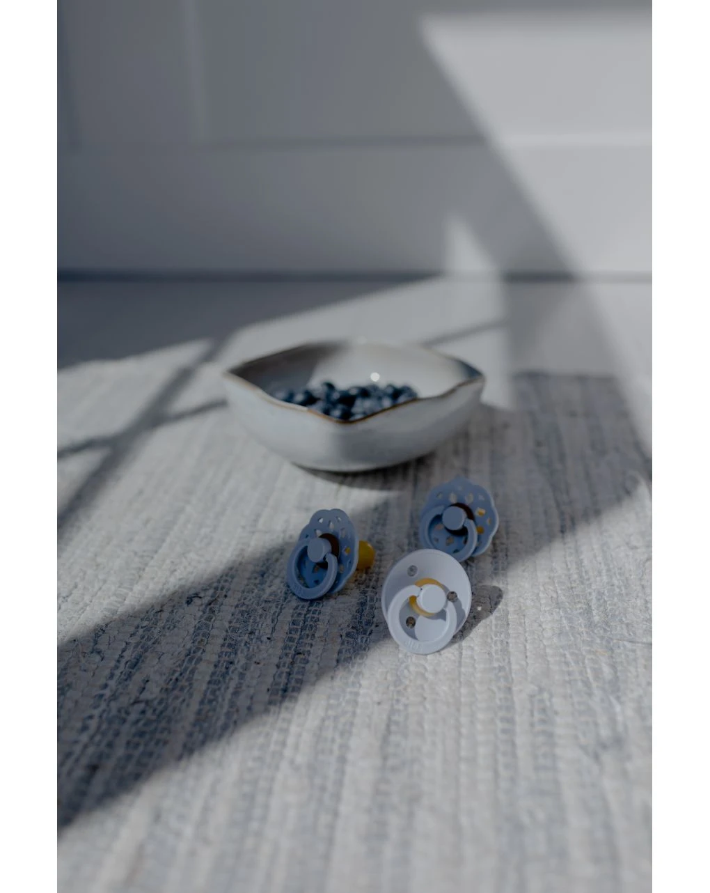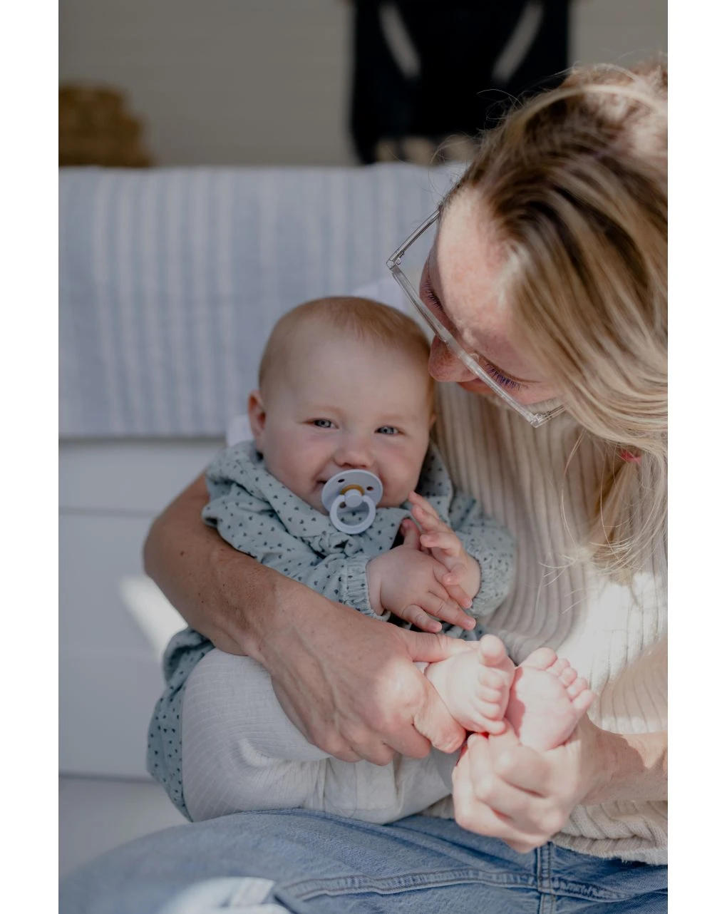 Pulire e sterilizzare il ciuccio giornalmente immergendolo in acqua calda. Si consiglia di non sterilizzare il prodotto in microonde, di non usare detergenti e di non lavare in lavastoviglie. Disegnato e prodotto in Danimarca. Sostituire i ciucci ogni 4-6 settimane.
