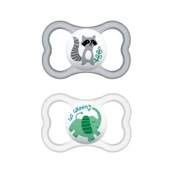 La pelle dei bimbi è particolarmente sensibile e si irrita facilmente. Con il set da 2 ciucci dal design innovativo, ha voluto creare un prodotto anti-irritazione. La mascherina dispone di fori particolarmente ampi che lasciano traspirare la pelle dei bambini. I bordi arrotondati prevengono la formazione di segni e irritazioni. La tettarella è costituita da speciale silicone SkinSoft che risulta talmente morbido e sicuro da venire istintivamente accettato dal 94% dei bambini*. Sia la tettarella che la mascherina hanno una forma simmetrica ed ergonomica, che permette al ciuccio di mantenere sempre una posizione ottimale in bocca. Il bottone è facile da afferrare e da tenere in mano, ma al contempo anche così piatto da consentire ai bambini di assumere qualunque posizione desiderino. La confezione include una custodia adatta anche per il trasporto e la sterilizzazione al microonde.