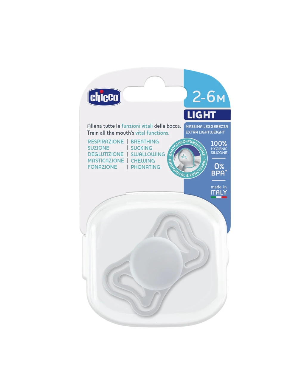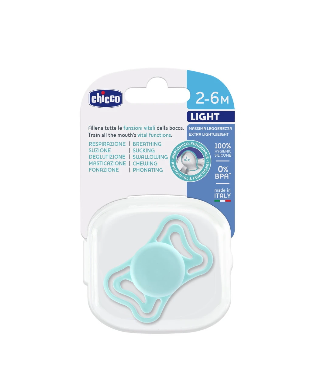 Gommotto realizzato in morbido silicone, supporta la respirazione fisiologica e favorisce il corretto sviluppo della bocca del bambino. Esclusiva PhysioForma del gommotto Chicco: forma anatomico-funzionale esclusiva di tutti i ciucci Chicco, studiata per favorire e stimolare le funzioni vitali della bocca durante la suzione non nutritiva mantenendo il posizionamento fisiologico della lingua, alta sul palato. Extra leggero e confortevole per il bambino, Physioforma® Light si illumina al buio.